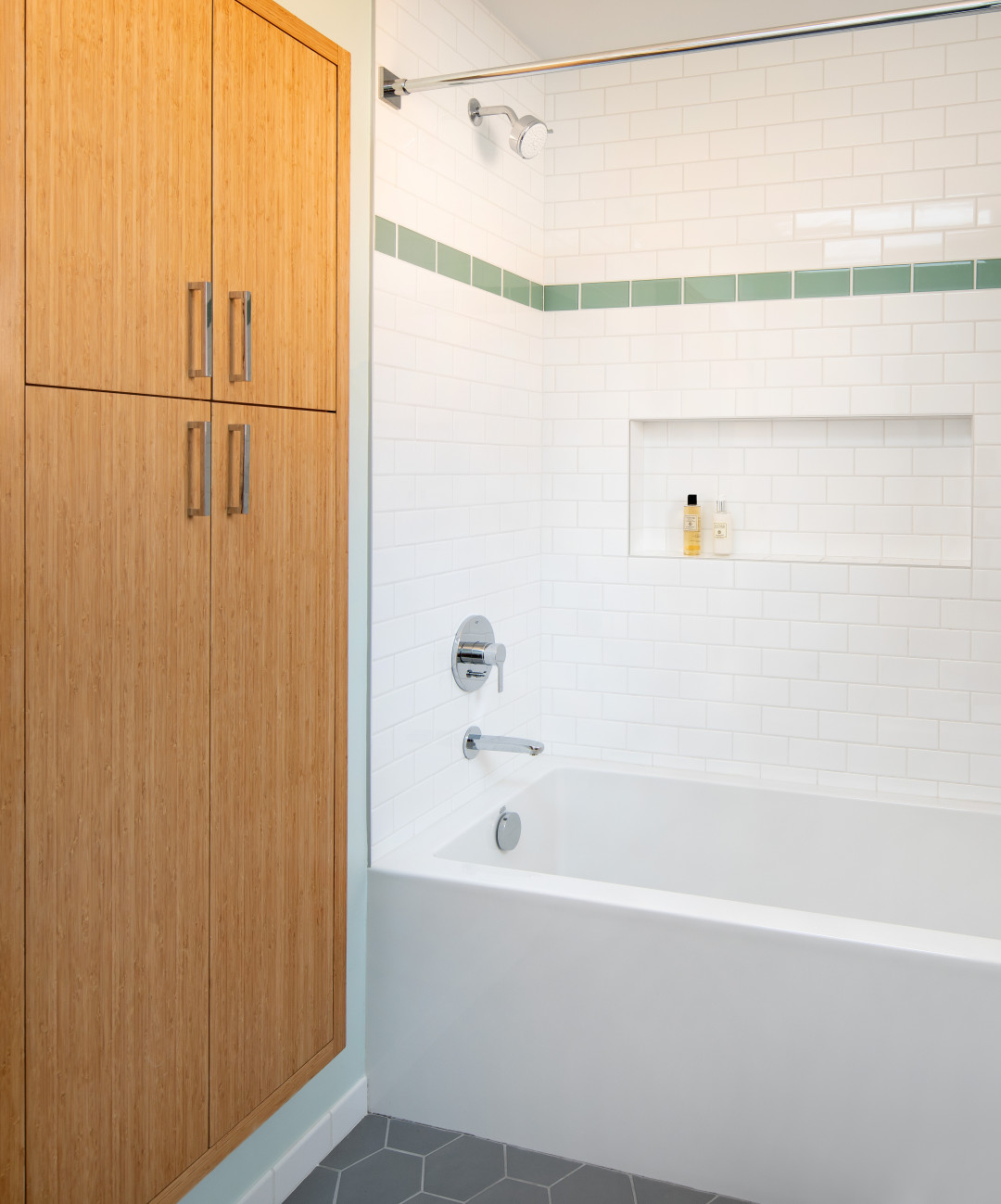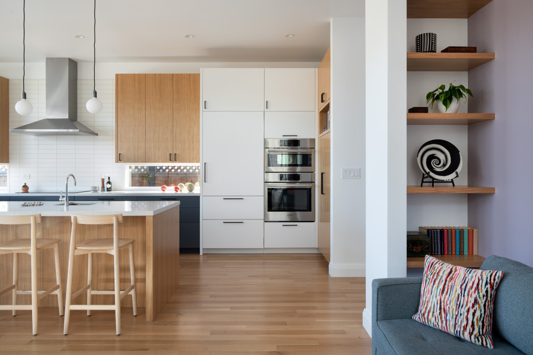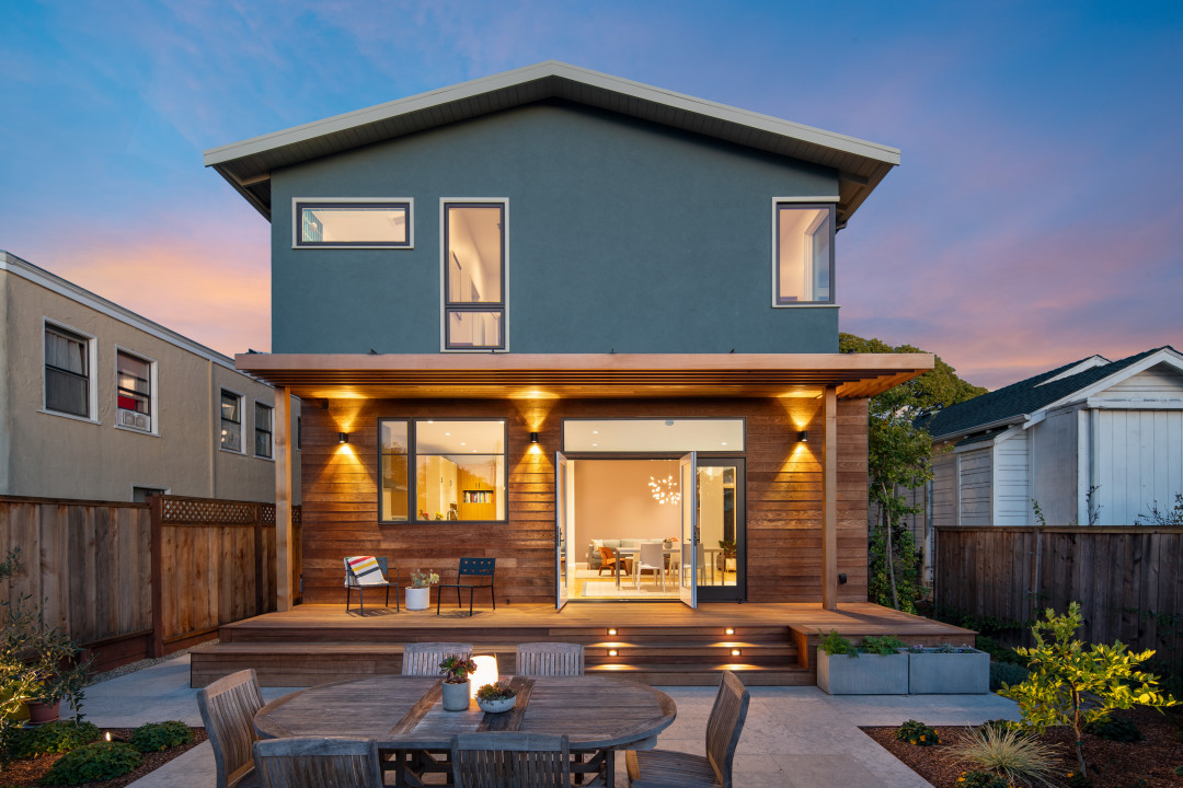 Full remodel of a 1930 bungalow. The house was raised 5', the foundation was replaced, and a new first floor was built before lowering the original structure onto the new construction. The original stucco was removed, all new doors and windows were installed, and the walls and floors were stripped down to studs and replaced with all-new finishes. The mechanical, electrical, and plumbing systems were replaced, and new decks and trellises were added.